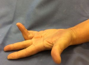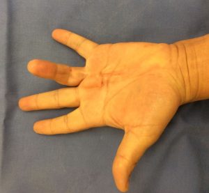 La Enfermedad de Dupuytren es una enfermedad en la que la capa gruesa de tejido (Fascia Palmar) localizada entre la piel y los tendones de la palma de la mano se engruesa y/o contrae (Figuras 1 y 2). A veces se pueden notar nódulos y cordones como masas en la palma de la mano y de los dedos. Este tejido (Fascia Palmar) engrosado se puede contraer progresivamente y producir una posición en flexión involuntaria de los dedos, limitando la extensión completa de los nudillos y de las articulaciones de los dedos. Al igual que pasa en la mano, las mismas estructuras en el pie pueden verse afectadas.