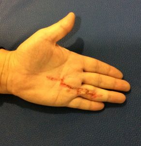 La Enfermedad de Dupuytren progresa lentamente. Por norma general es diagnosticada en hombres mayores de 40 años y suele comenzar como un pequeño “bulto” en la palma de la mano. A medida que progresa, la formación de los cordones gruesos desde la palma de la mano hasta los dedos puede empezar a producir la contractura en flexión de los dedos. Los dedos más frecuentemente afectados son el meñique y el anular. Usualmente los pacientes consultan a su Cirujano de Mano cuando la contractura en flexión de los dedos ya es permanente y limita el uso normal de la mano. Una queja frecuente de los pacientes son la dificultad para meter la mano en los bolsillos y la imposibilidad de poner la mano plana sobre una mesa debido a la imposibilidad de extender (estirar) los dedos por completo.