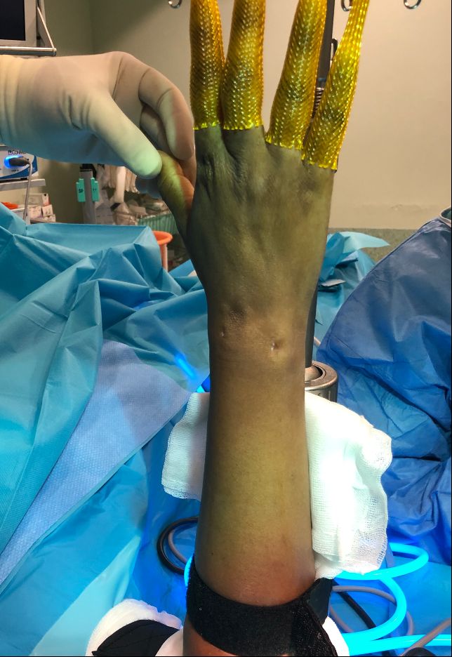 Tras la cirugía (Figura 4) se suele aplicar un vendaje o una férula para minimizar el dolor post-quirúrgico. Los puntos se suelen retirar de 7 a 10 días después del procedimiento. En ocasiones es preciso un periodo de Rehabilitación, si se desarrolla algo de rigidez en la muñeca o los dedos tras la cirugía.