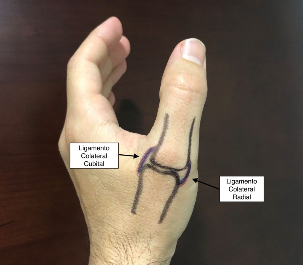El ligamento colateral radial está al otro lado de esta articulación del pulgar. Puede desgarrarse, pero no es tan común como el desgarro o rotura del ligamento colateral cubital. En la Figura 1 pueden verse dibujados ambos ligamentos.
