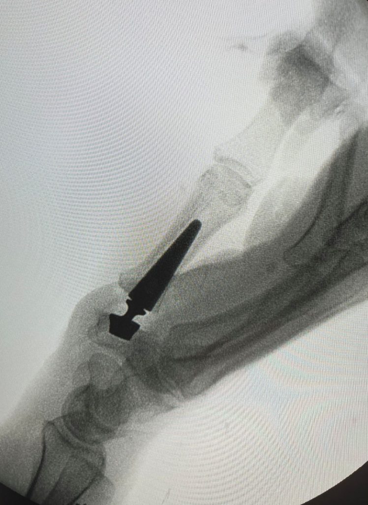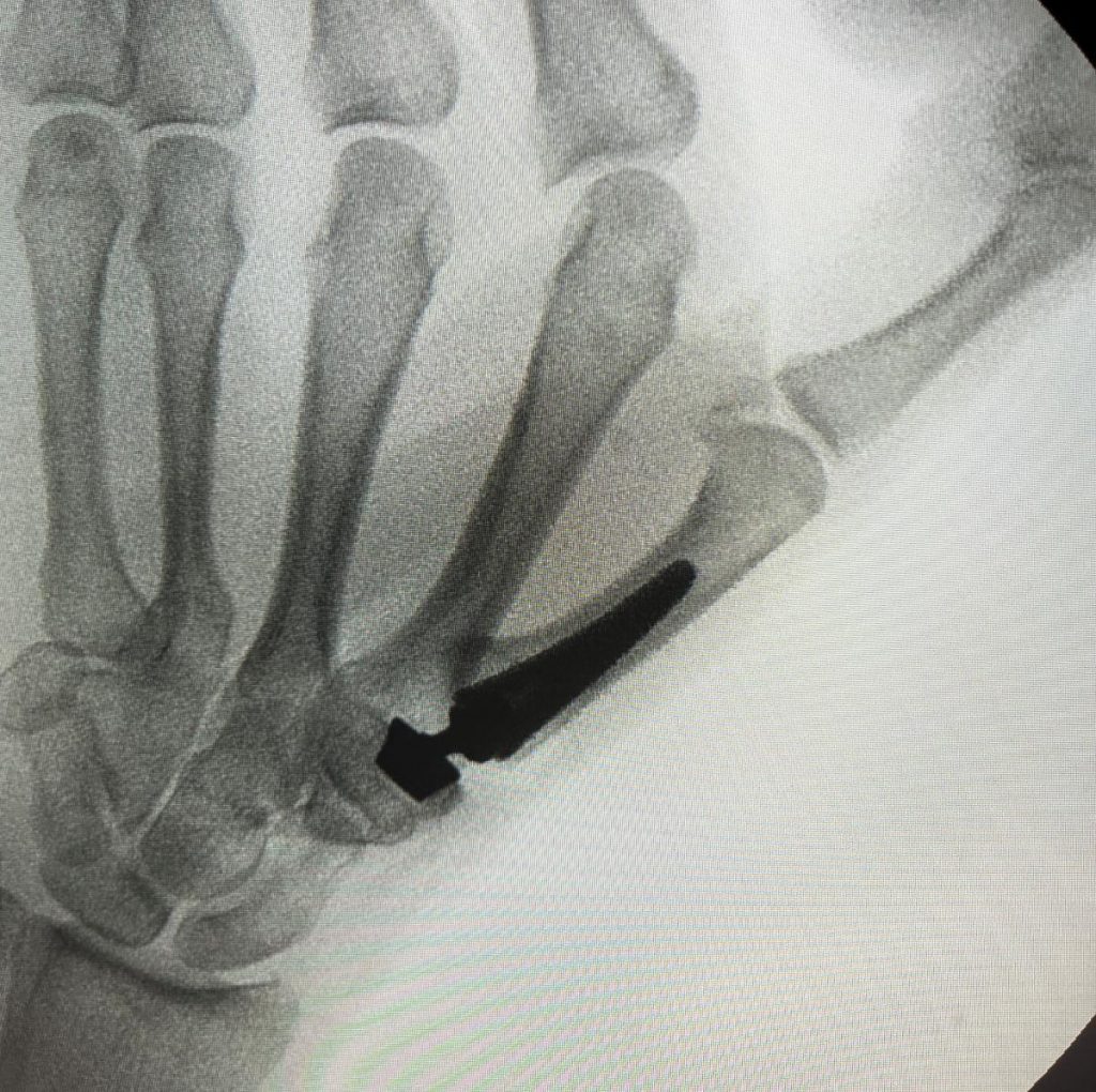 Los pacientes que no responden a tratamiento conservador pueden necesitar cirugía. Están descritas diferentes técnicas para tratar la Rizartrosis. Entre las más utilizadas están las prótesis (Figuras 3 y 4), que permiten una recuperación funcional rápida con una muy buena respuesta al dolor. El Dr. Polo le informará de cuál es la opción más adecuada a su caso.
