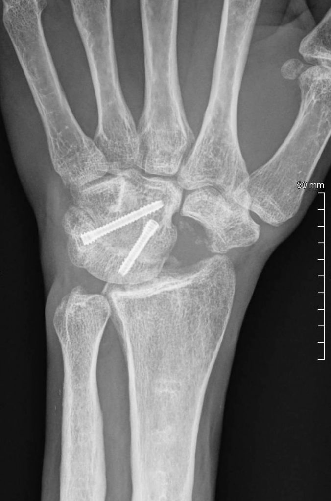 Figura 3 - Rx postquirúrgica pseudoartrosis escafoides con injerto.